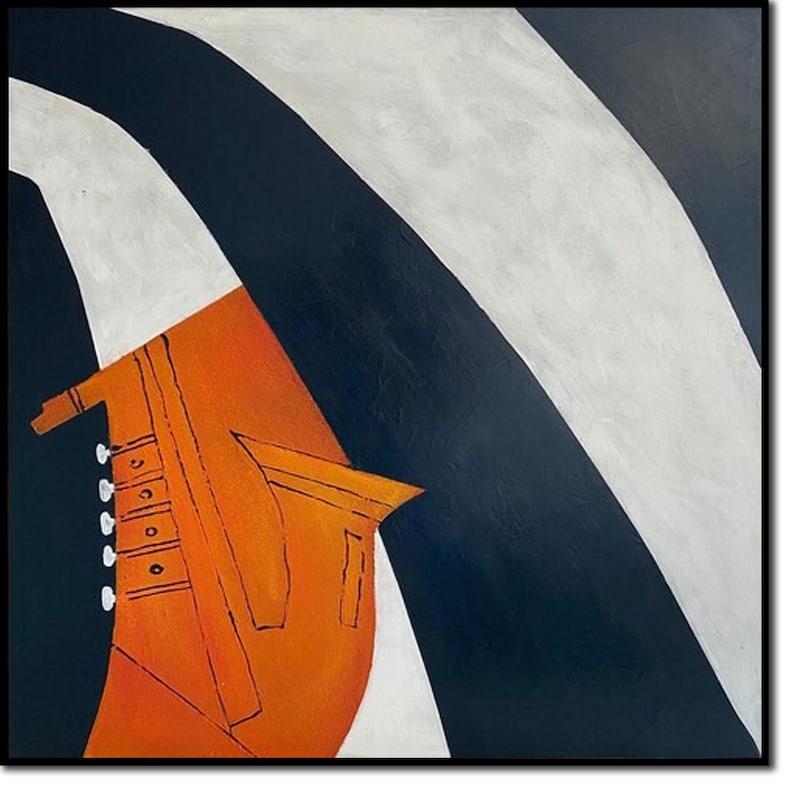Abstract Set of 2 Acrylic Minimalist Paintings On Canvas Geometric Figures Musical Instruments Red Guitar and Orange Trumpet Art Wall Decor
