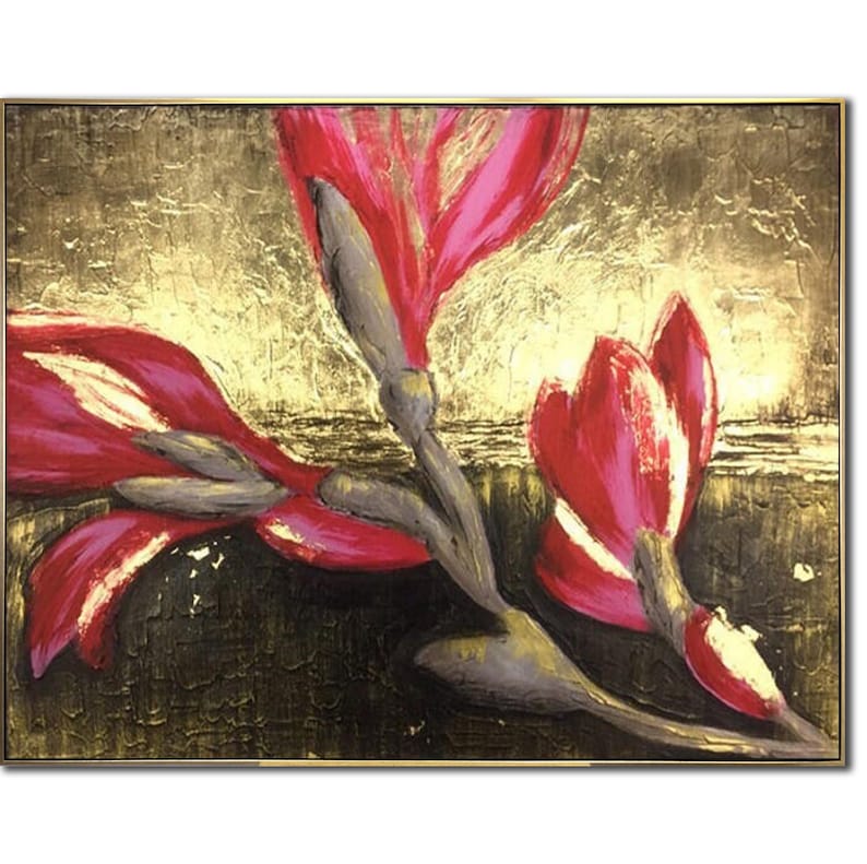 Hand-Painted Red Floral on Gold Abstract Art - Large Modern Wall Decor for Living Room - Elegant Textured Canvas Art