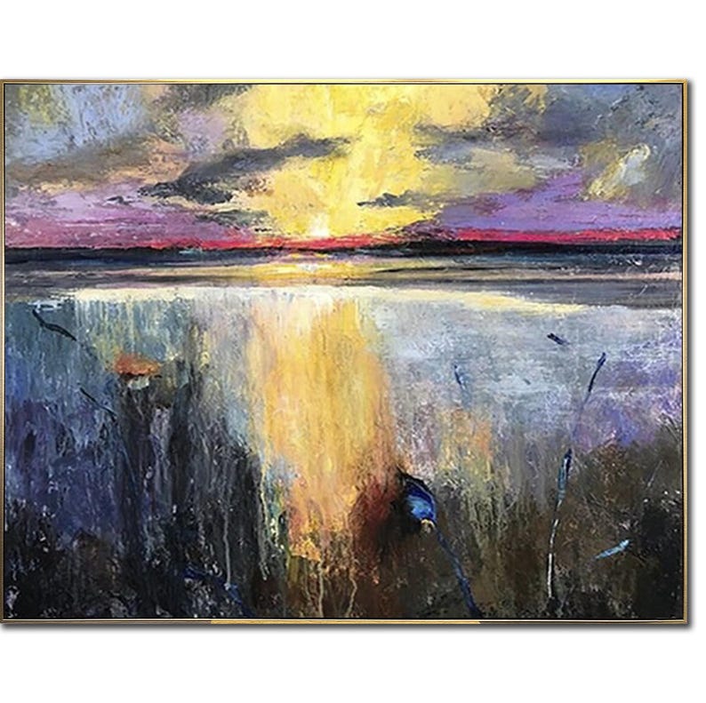 Sunset Painting Original Painting Golden Sunset Tranquil Lake Painting Coastal Wall Decor Living Room Decor Framed Art Apartment Wall Art