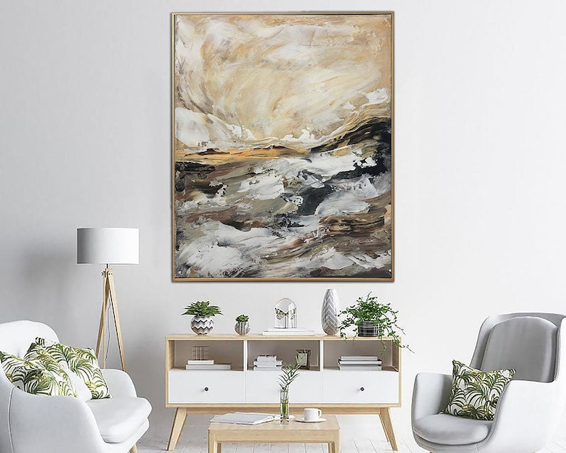 Abstrakt beige maleri stort oliemaleri moderne vægkunst brunt maleri på lærred originalt kunstværk kontorvægdekoration tekstureret vægkunst