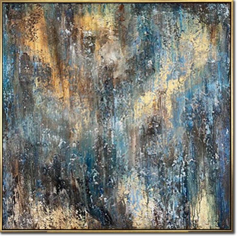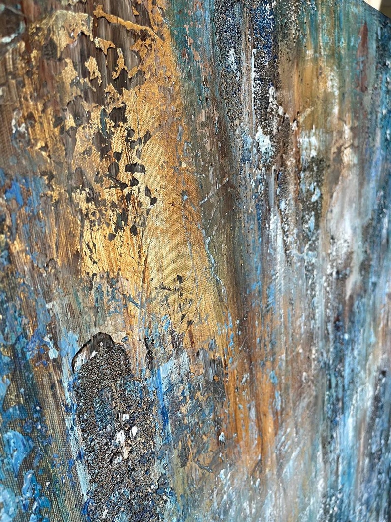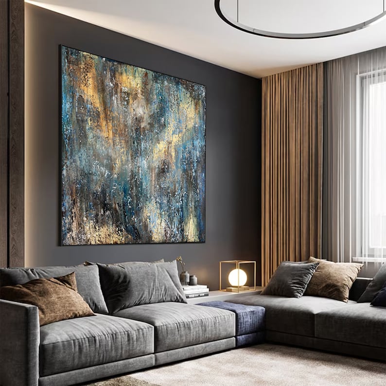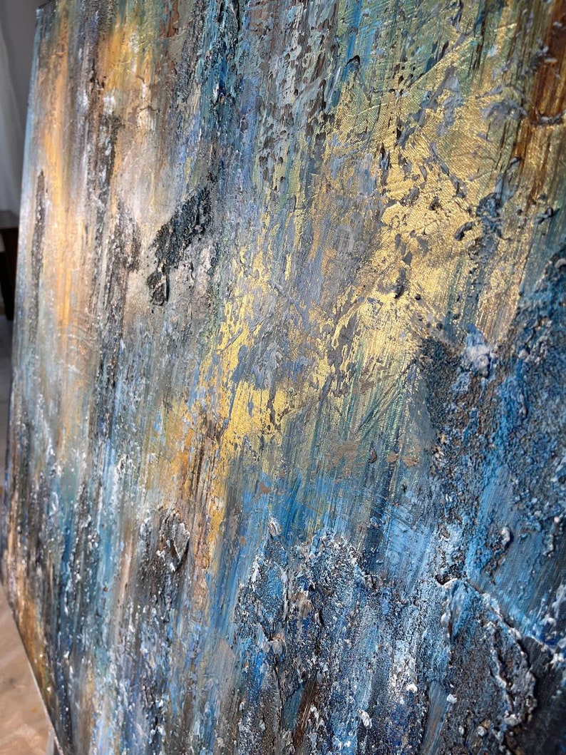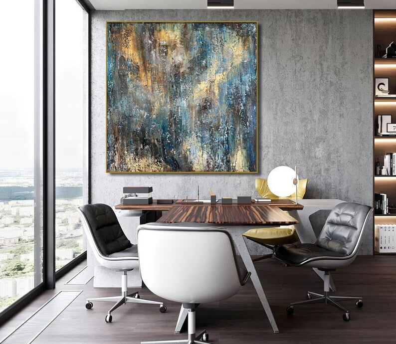Abstrakt tekstureret vægkunstmaleri blå og gyldne nuancer på lærred trendy vægkunst stort oliemaleri originalt maleri kontorvægdekoration