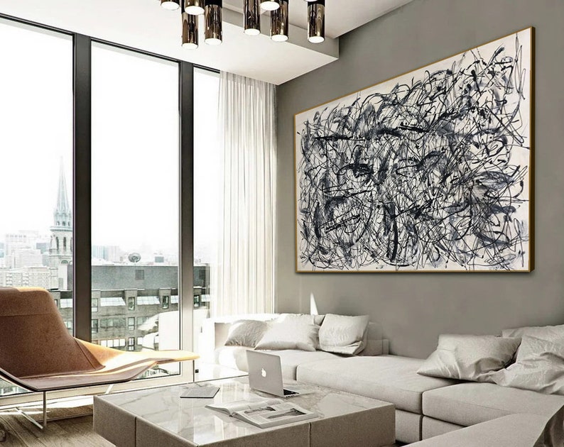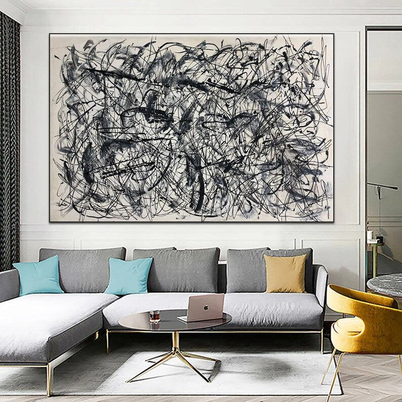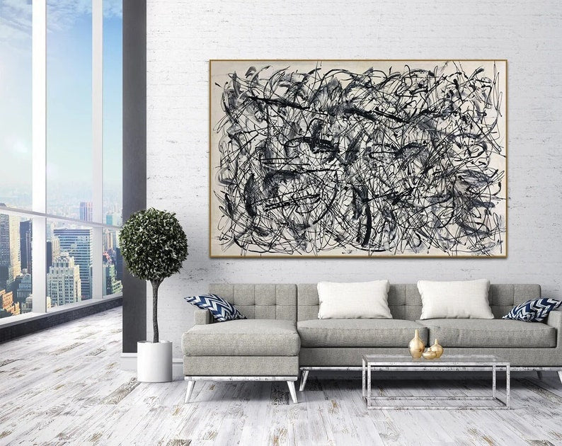 Sølv abstrakt maleri, gråt og hvidt lærred i stuen, ekstra stort lærred, sølv- og grå flydende abstrakt lærredsvægkunst