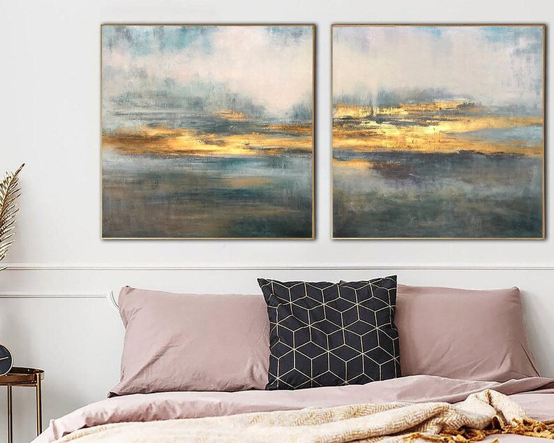 Large Sunset Painting Set of 2 Gray Painting Seascape Canvas Art Acrylic Sunset Wall Art on Canvas Original Artwork Living Room Wall Decor