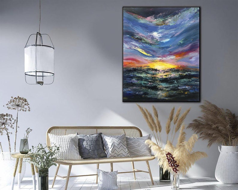 Sunset Painting Ocean Waves Wall Art Framed Statement Wall Art Large Canvas Painting Colorful Wall Art Abstract Seascape Art Sky Landscape
